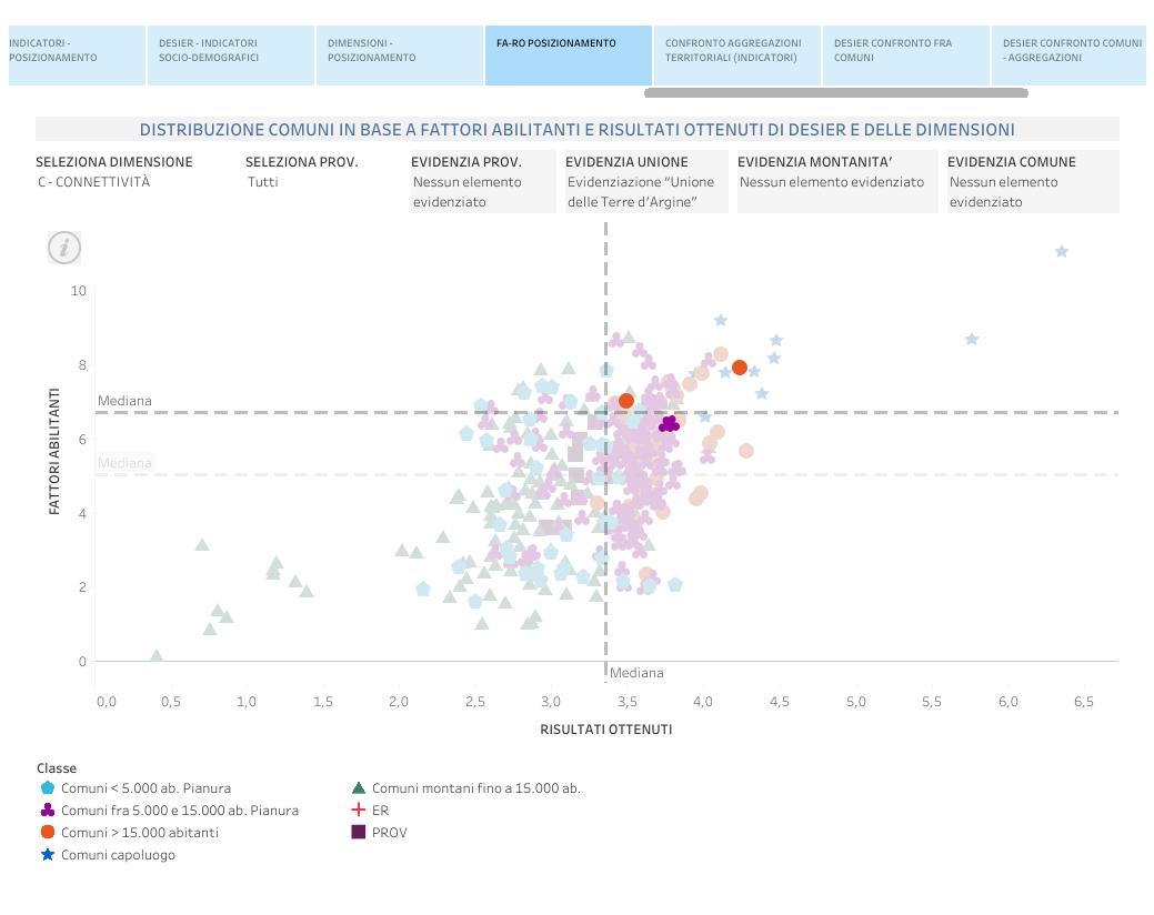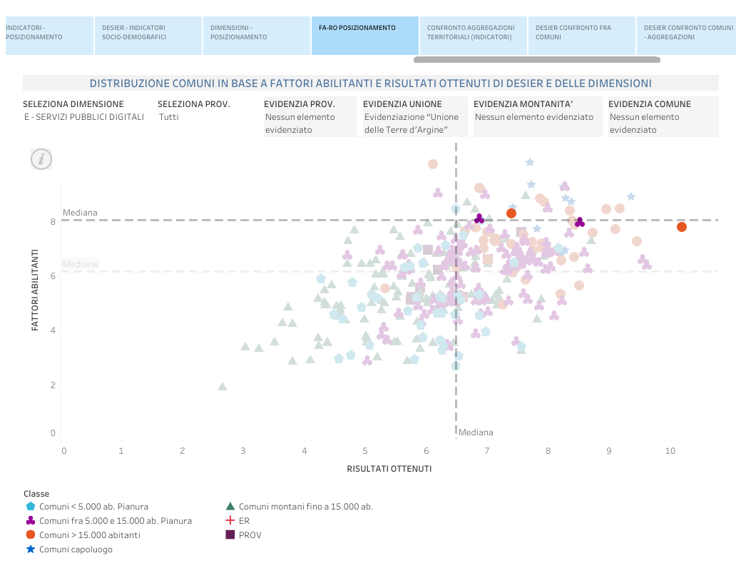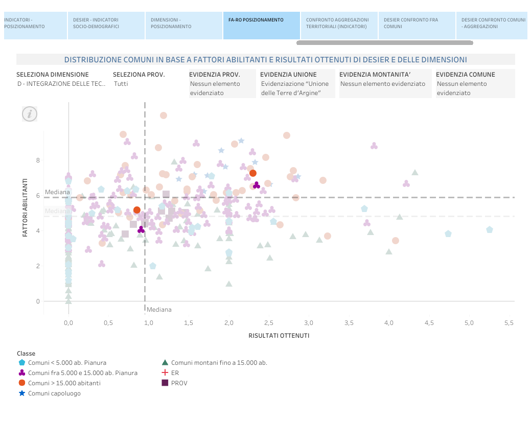 Tra le molteplici chiavi di lettura visuale dei dati offerte dal cruscotto DESIER, l’opzione FA-RO POSIZIONAMENTO permette di ricavare il posizionamento cartesiano delle Unioni, e dei Comuni che ne fanno parte, rispetto agli indicatori che misurano i fattori abilitanti, che abilitano la digitalizzazione dell’economia e delle società regionali, e i risultati ottenuti considerando DESIER e le sue quattro dimensioni d’analisi, intendendosi con risultati gli elementi che misurano l’effettiva trasformazione digitale dell’economia e delle società. Tale vista è utile per di identificare gli eventuali margini di omogeneità o disomogeneità fra i Comuni del territorio, e per quanto riguarda l’Unione Terre d’Argine, restituisce particolari disomogeneità sulla dimensione Capitale umano, a fronte di una maggiore omogeneità sul versante della Connettività.